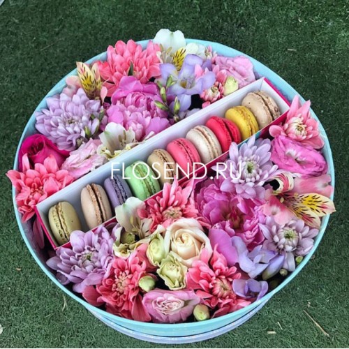 Роза кустовая малиновая, кремовая и макаронс в коробке в Ногинске